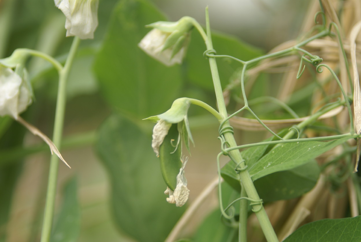 白い花びらの下からグリーンのさやが顔をだし、花びらが抜け落ちて実が大きくなっていく。