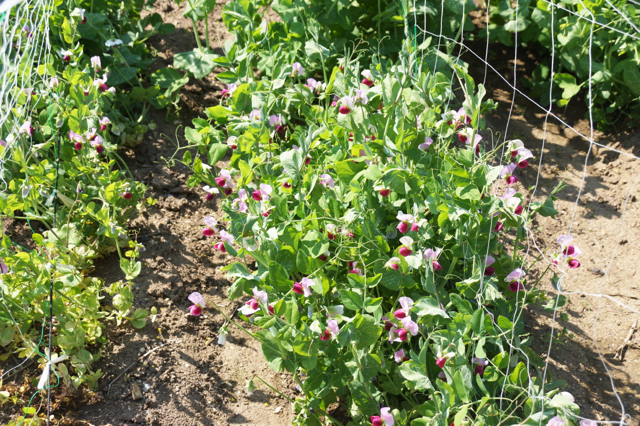 畑のえんどうも寒さのせいか成長が悪いが花がさきだした。