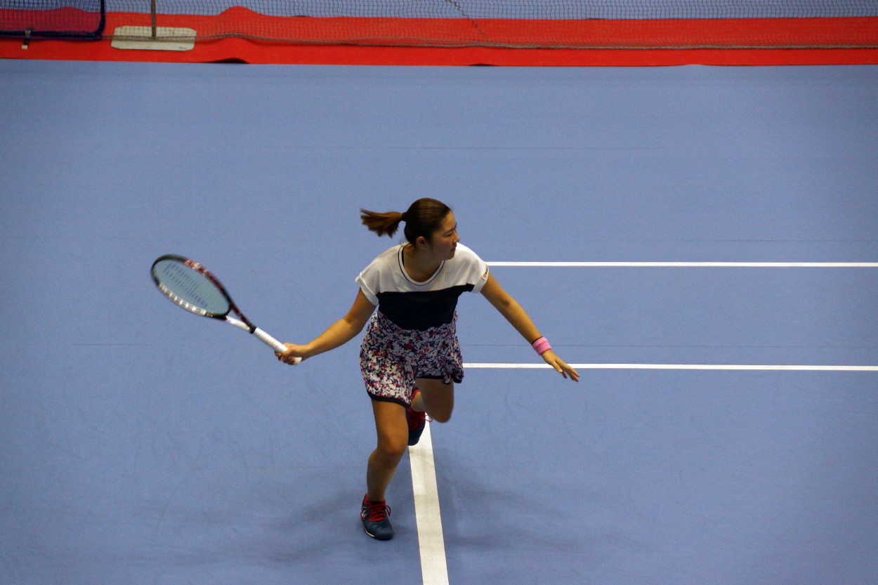 宮村選手は女子では珍しい片手バックハンド。スライスが多いのかと思いきや、走らされて遠いボール以外はけっこうスピン系が多かった。