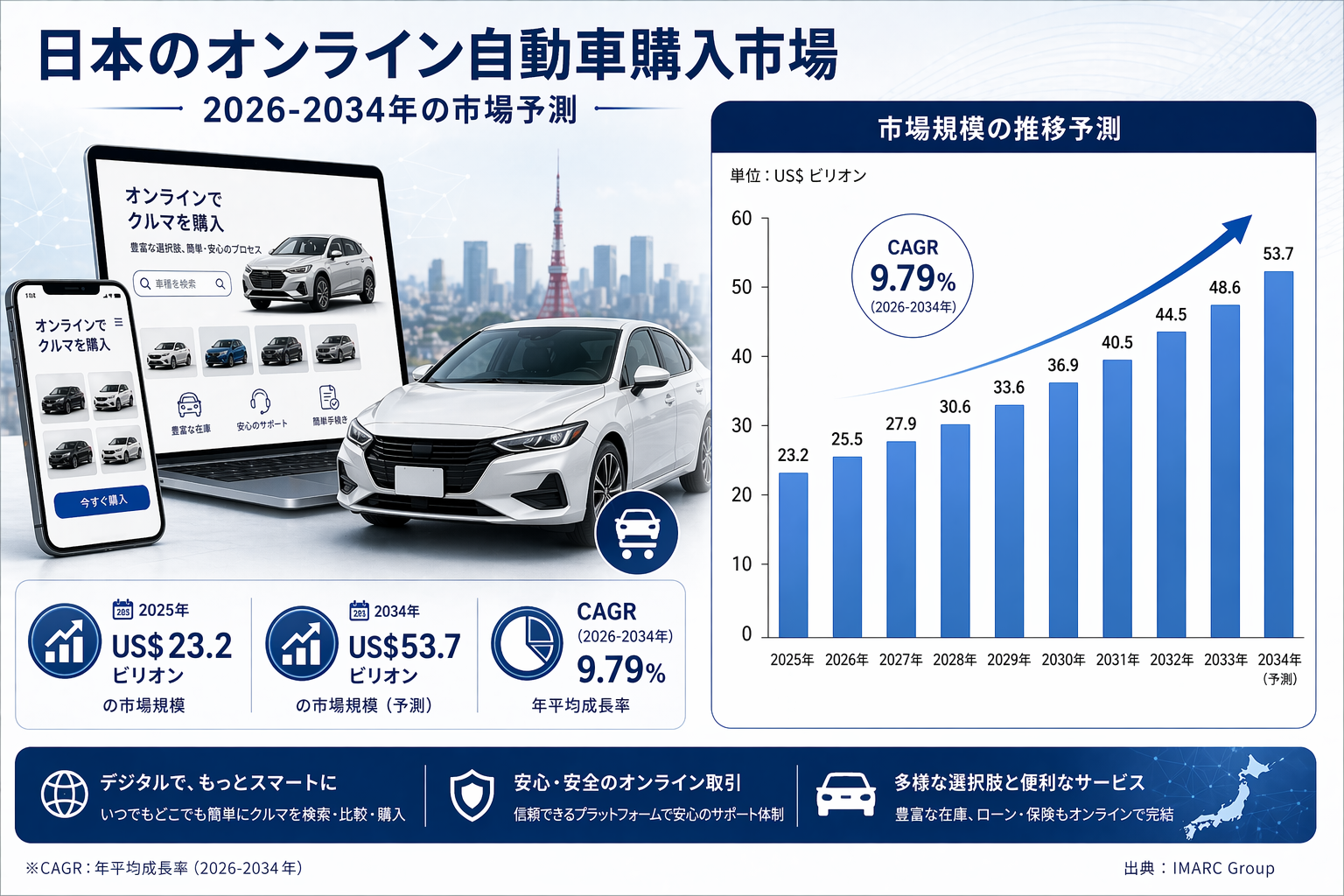 IMARCグループが発表した最新レポート「日本のオンライン自動車購入市場:業界動向、シェア、規模、成長、機会、予測2026-2034」によると、日本のオンライン自動車購入市場規模は2025年に232億米ドルに達しました。IMARCグループは今後、同市場が2034年までに537億米ドルに達し、2026年から2034年にかけて年平均成長率(CAGR)9.79%で成長すると予測しています。