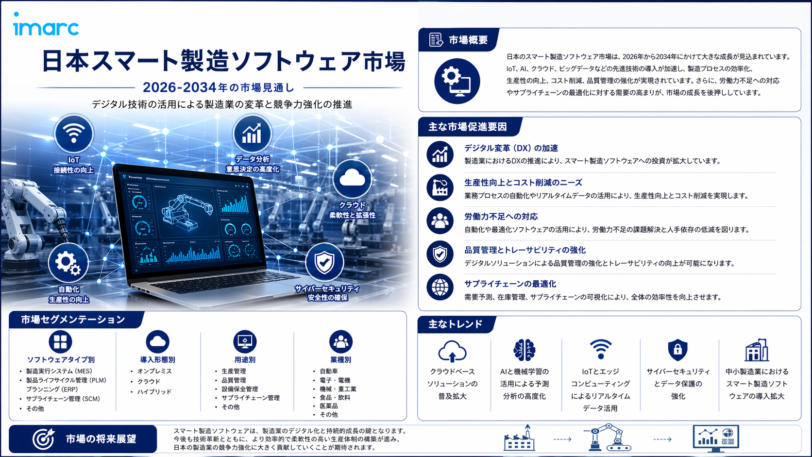 2026年の日本のスマート製造ソフトウェア市場を分析する場合、IMARCグループのレポートは、日本の業界関係者向けにカスタマイズされた以下の包括的な市場インサイトを提供します。