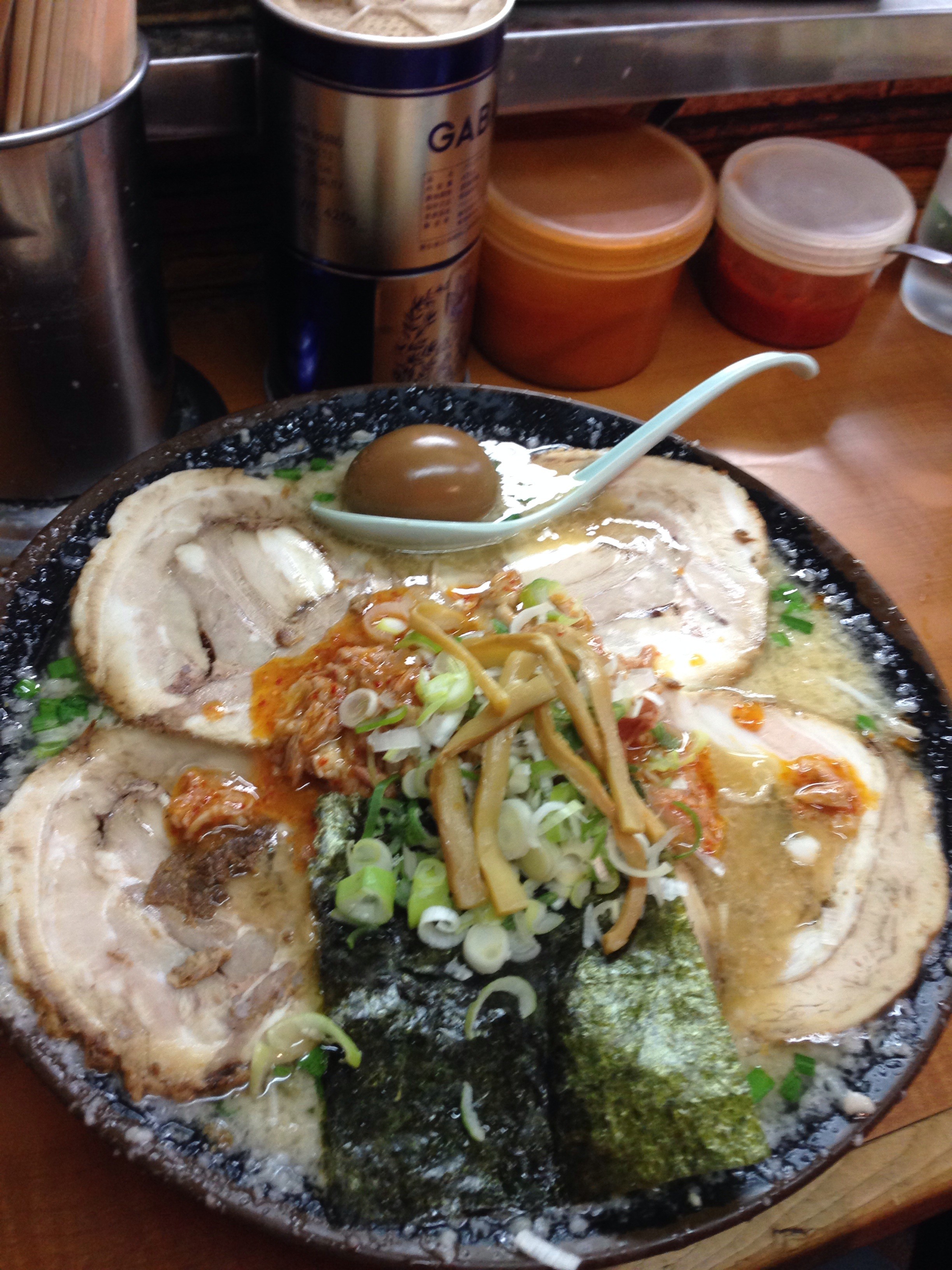 その上にピリ辛ホルモンと、手のひらサイズのチャーシューが器を埋め尽くします。