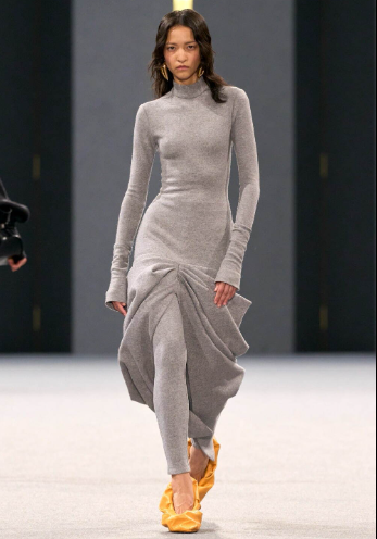 色彩は極めて抑制的で、グレー、ホワイト、ブラック、ベージュが中心。そこにオーガニックシルクやシフォン、ヴィーガンレザーといった素材が重なり、高品質なテクスチャーが際立つ。ステラマッカートニー コピー 装飾を排することで、素材そのものの高品質さが前面に押し出された構成だ。