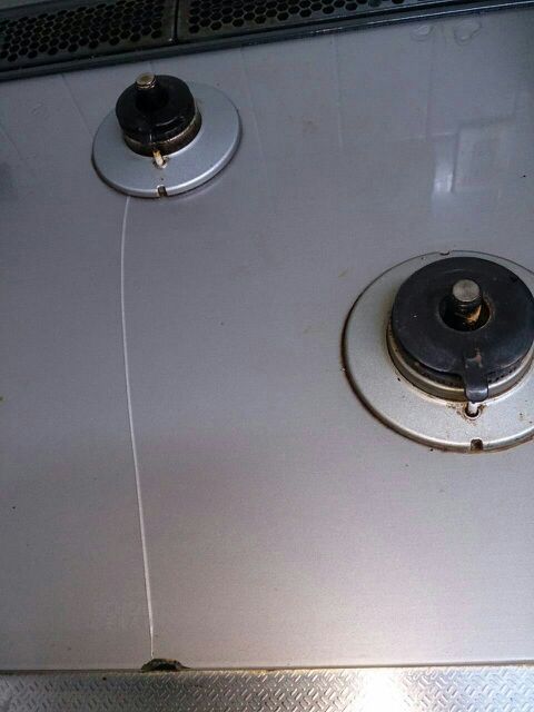 ちょうどコンロのガラストップの手前に当たったみたいで、