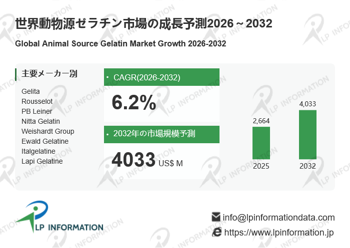 2026年3月,LP Information, Inc.(LPI)の最新調査レポート「世界動物源ゼラチン市場の成長予測2026~2032」は、過去の販売実績に基づいて2024年の世界全体の動物源ゼラチン販売状況を分析し、地域別及び市場セクター別に2025年から2032年までの販売予測を提供しています。同レポートは、地域、市場セクター、サブセクター別に分類された動物源ゼラチンの売上を百万米ドル単位で詳細に分析しています。