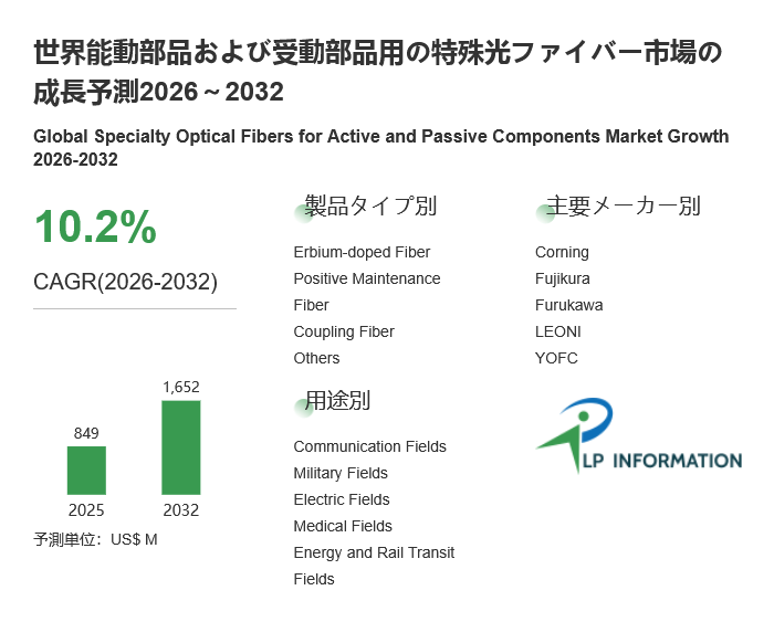 2026年3月、LP Information株式会社(所在地:東京都)が発表した最新の市場調査レポート「世界能動部品および受動部品用の特殊光ファイバー市場成長予測レポート(2026-2032年)」です。本のレポートは、単なるデータ集計にとどまらず深い洞察を提供し、競合企業マップ、収益シェア、市場動向、業界のM&A活動などを通じて、全球能動部品および受動部品用の特殊光ファイバー市場の全体構造と主要なトレンドを体系的に明らかにしています。また、全球リーダー企業の製品ライン戦略、技術力、市場参入戦略、競争ポジション、地理的分布を重点的に分析し、急速に進化する市場における主要プレイヤーの独自ポジショニングと戦略的差異を明らかにしています。