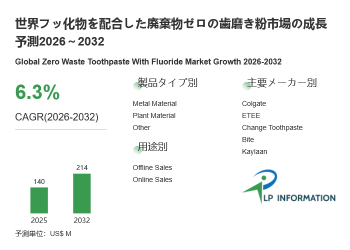 2026年3月、LP Information株式会社(所在地:東京都)が発表した最新の市場調査レポート「世界フッ化物を配合した廃棄物ゼロの歯磨き粉市場成長予測レポート(2026-2032年)」です。本のレポートは、単なるデータ集計にとどまらず深い洞察を提供し、競合企業マップ、収益シェア、市場動向、業界のM&A活動などを通じて、全球フッ化物を配合した廃棄物ゼロの歯磨き粉市場の全体構造と主要なトレンドを体系的に明らかにしています。また、全球リーダー企業の製品ライン戦略、技術力、市場参入戦略、競争ポジション、地理的分布を重点的に分析し、急速に進化する市場における主要プレイヤーの独自ポジショニングと戦略的差異を明らかにしています。