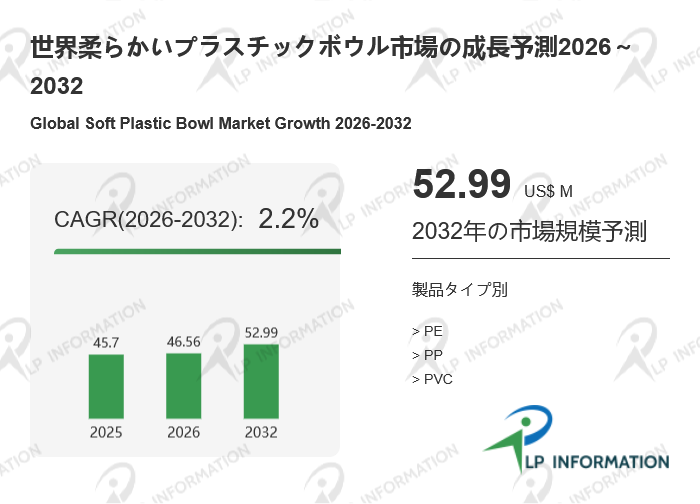 LP Information株式会社(本社:東京都)が発表した最新の「世界柔らかいプラスチックボウル市場の成長予測2026~2032」は、信頼性の高い過去のデータを基に、2025年の全球柔らかいプラスチックボウル市場の販売実績を体系的に分析し、2026年から2032年までの業界の将来予測を詳細に行っている。本報告書では、地域別・市場セグメント別・細分分野別で、詳細な市場規模分析と将来展望が示されている。