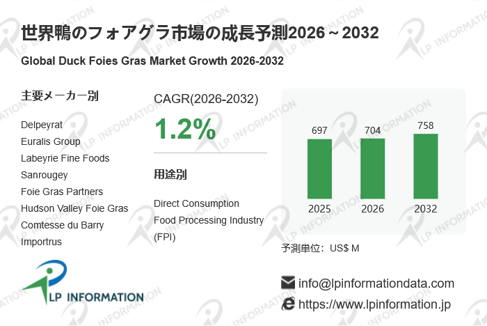 原文をご覧になるか、無料サンプルをご希望の場合はお問い合わせください:https://www.lpinformation.jp/reports/775485/duck-foies-gras
