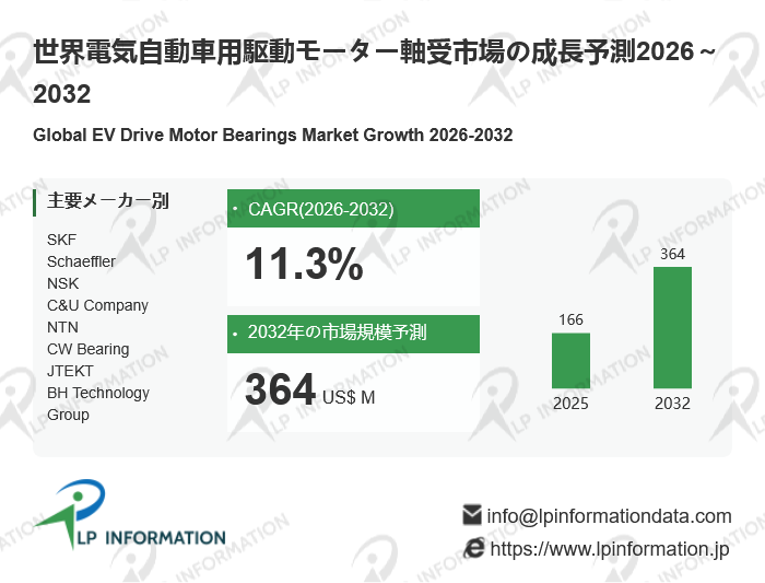 2026年4月、LP Information株式会社(所在地:東京都中央区)の最新調査レポート「世界電気自動車用駆動モーター軸受市場の成長予測2026~2032」は、過去の販売実績に基づいて2025年の世界全体の電気自動車用駆動モーター軸受販売状況を分析し、地域別及び市場セクター別に2025年から2032年までの販売予測を提供しています。同レポートは、地域、市場セクター、サブセクター別に分類された電気自動車用駆動モーター軸受の売上を百万米ドル単位で詳細に分析しています。
