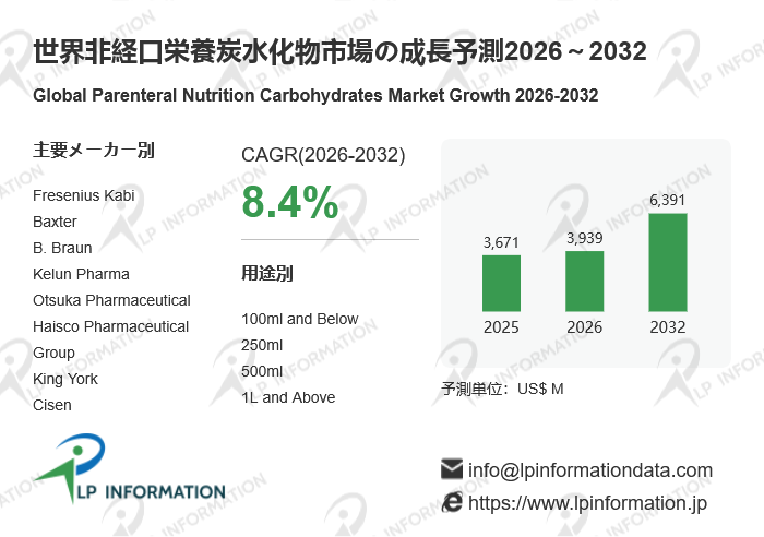 LP informationは、市場調査レポート「世界非経口栄養炭水化物市場の成長予測2026~2032」を発行しました。本レポートでは、世界の非経口栄養炭水化物市場における競争環境を包括的に分析し、当該製品セグメントに関連する主要動向、ならびに非経口栄養炭水化物における上位10社の収益および市場シェアに重点を置いています。また、急成長する世界市場において、各メーカーの独自のポジションを洞察するために、非経口栄養炭水化物レポートでは、各地域における市場シェア、売上高、収益、市場ポジション、成長見通しに焦点を当て、世界の主要企業の戦略を詳細に分析しています。