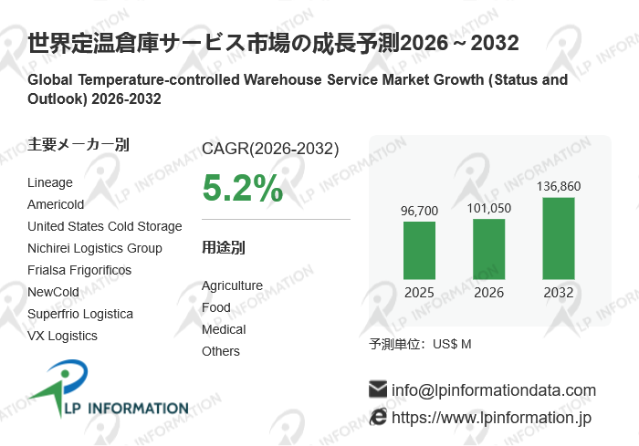 LP Information株式会社(本社:東京都)が発表した最新の「世界定温倉庫サービス市場の成長予測2026~2032」は、信頼性の高い過去のデータを基に、2025年の全球定温倉庫サービス市場の販売実績を体系的に分析し、2026年から2032年までの業界の将来予測を詳細に行っている。本報告書では、地域別・市場セグメント別・細分分野別で、詳細な市場規模分析と将来展望が示されている。