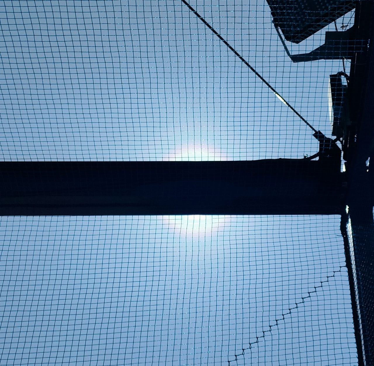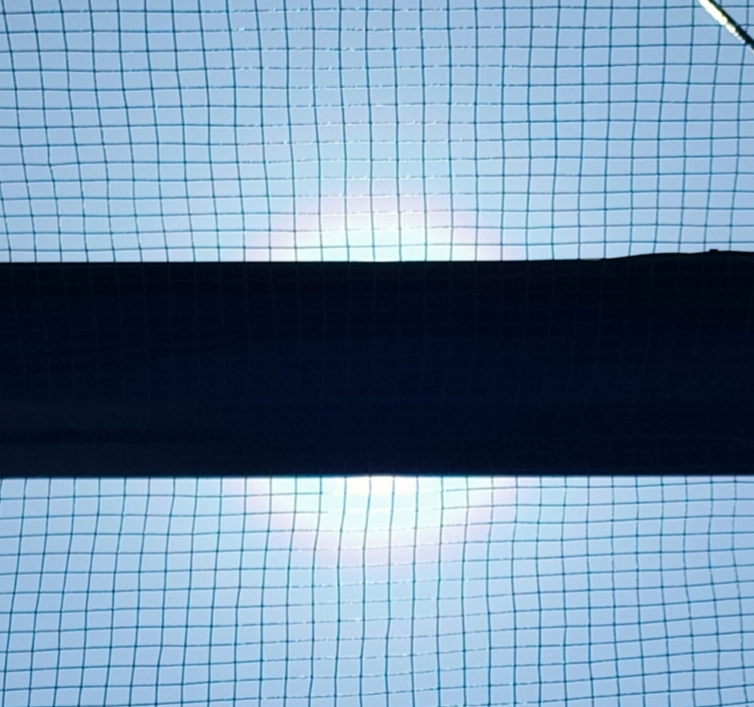 こちらは、コートの天井と太陽が重なっておりますが、太陽の周りに虹色の輪が出来上がってます。