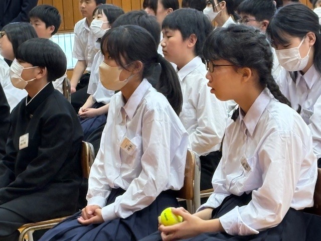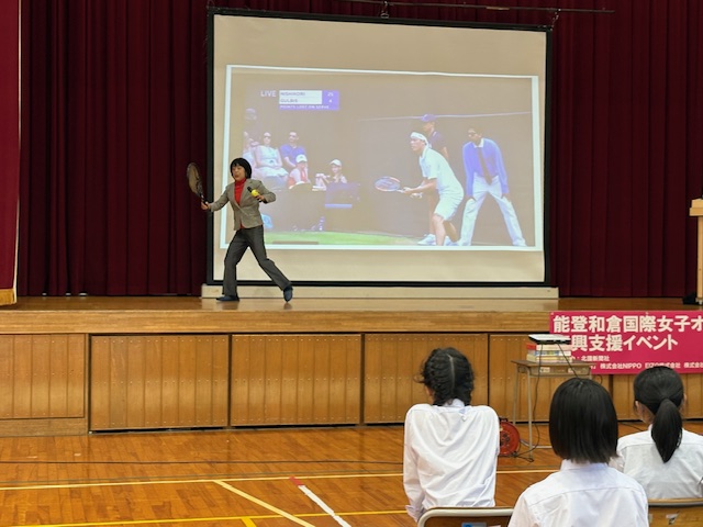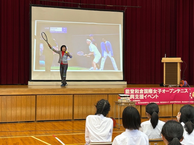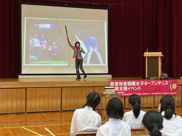 今日の講演は、能登和倉国際女子オープンテニスの復興支援イベントの一環の学校訪問です。