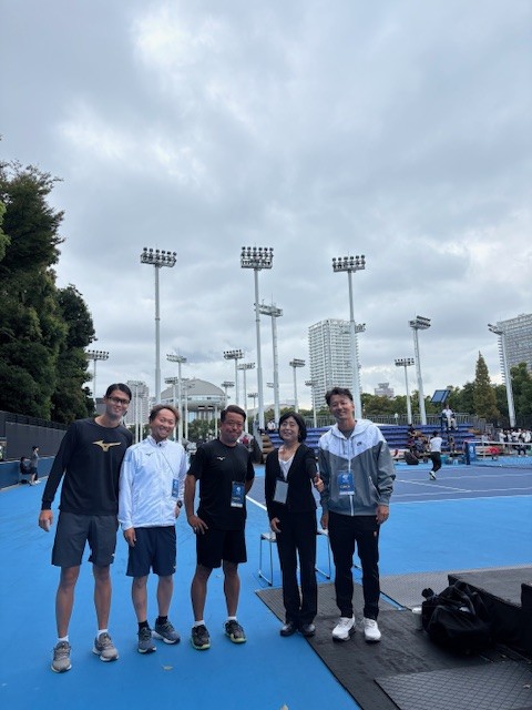 私と大野さんは当然ですが、なんと、東京国際大学硬式庭球部コーチの江原弘泰プロ、吉村健児トレーナー、茂木駿一トレーニングコーチまで、ゾロゾロと応援に来てくれて私は感激しました。