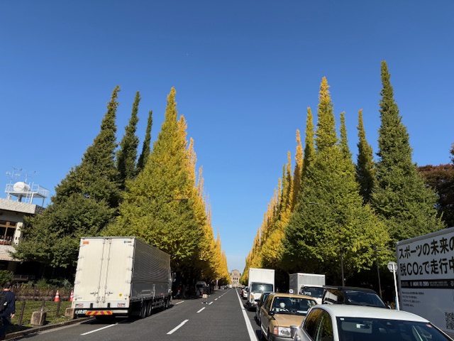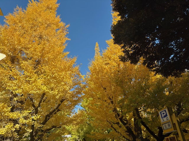 しかもこの青空と黄色い銀杏並木の鮮やかなこと。