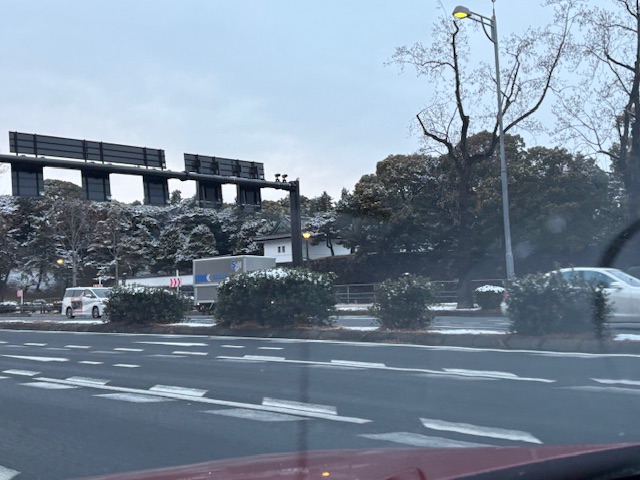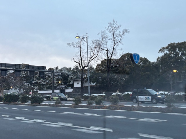 雪が皇居の木々の上に積もっていました。