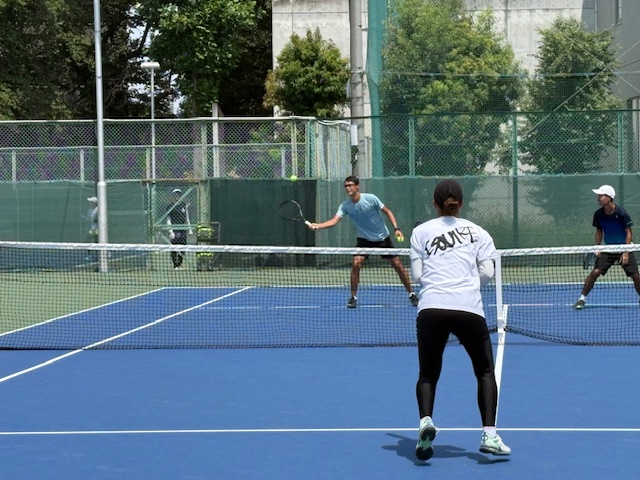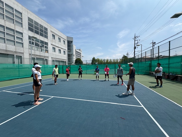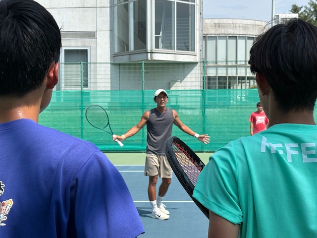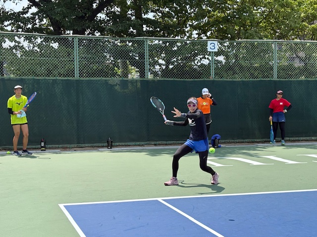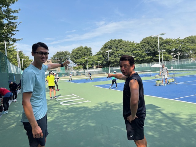 私はいつも室内で練習しているので、外コートでの練習に少し戸惑いました。