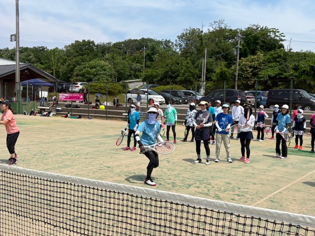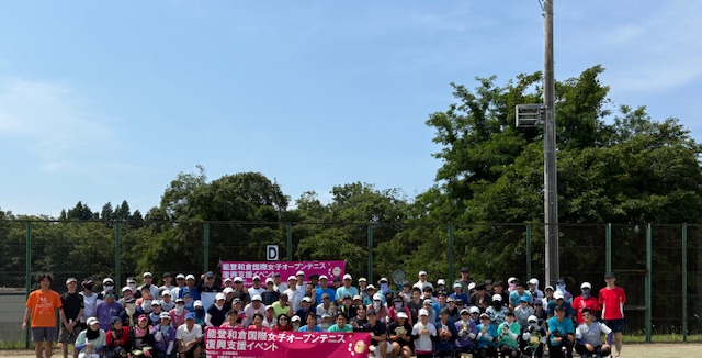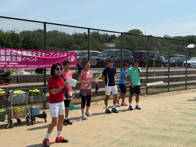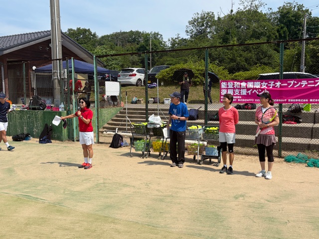 志賀町テニス協会の方々が、色々な準備や駐車場、受付などをしっかり計画して下さったお陰で、スムーズに開会式も行われました。 106名の参加者で、私はとてもとても心配していました。 ボランティアで来てくれたプロ達も、参加者の皆様も協力してくれてみんなで作ったレッスン会がスタートしました。佐藤直子
