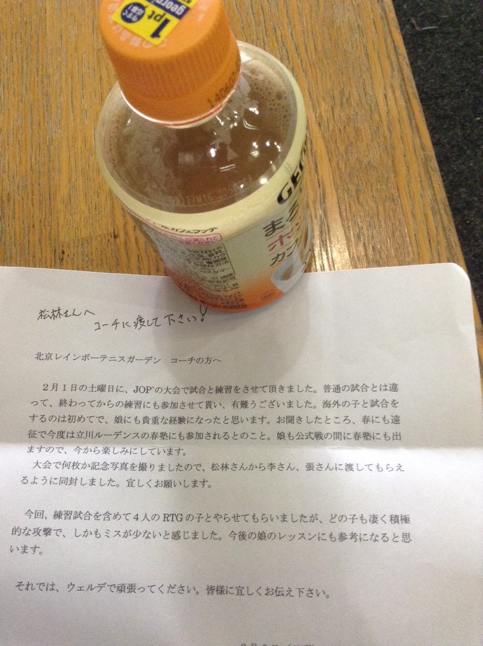 山梨遠征1日目のjopの試合で対戦した女の子のご両親から手紙をいただきました。
