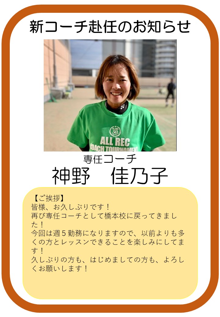 専任コーチとして神野佳乃子コーチが週5日での勤務となります。