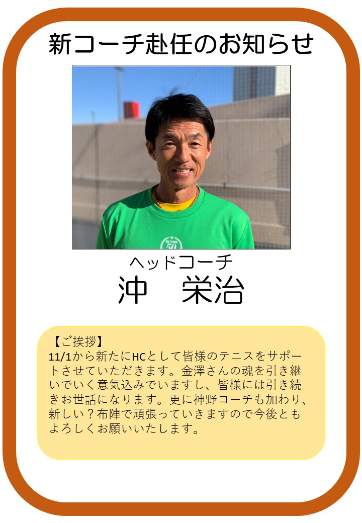沖コーチが新ヘッドコーチとして勤務いたします。