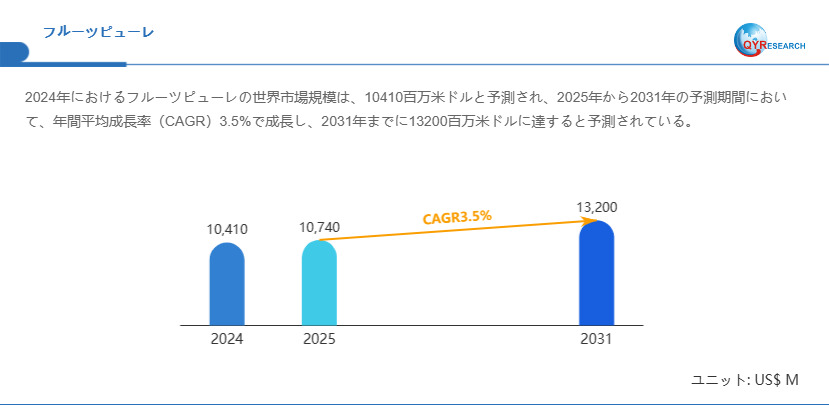 QYResearchが発表した新たな市場調査レポート「フルーツピューレ―グローバル市場シェアとランキング、全体の売上と需要予測、2026~2032」 によると、世界のフルーツピューレ市場規模は2024年の約10410百万米ドルから2025年の10740百万米ドルへと順調に拡大すると見込まれ、予測期間中は年平均成長率(CAGR)3.5%で成長し、2031年には13200百万米ドルに達すると予測されています。