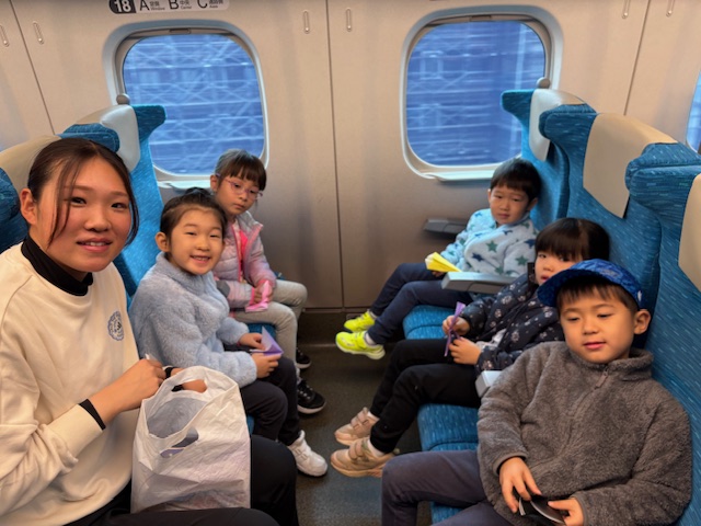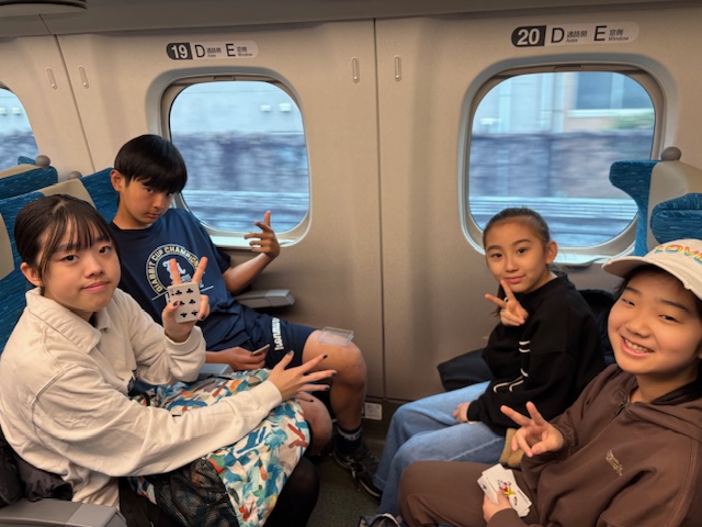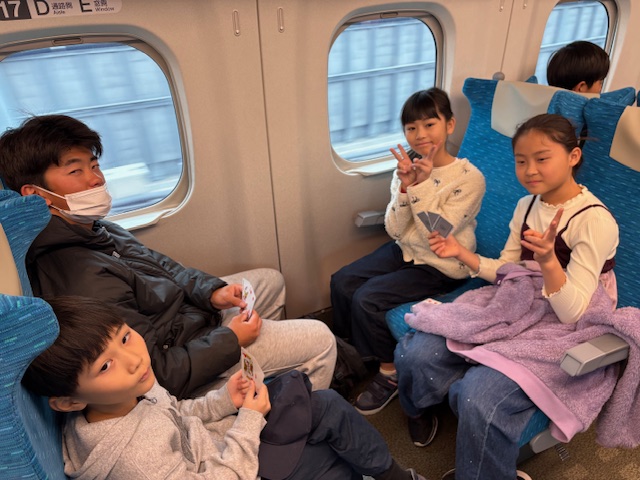 新幹線の中で、子供達はトランプをしたり、折り紙をしたりしています。
